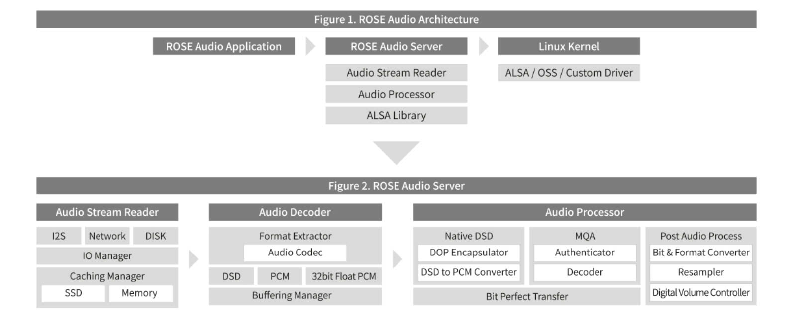 HiFi Rose có thể cung cấp dữ liệu âm thanh thuần túy nguyên bản đến DAC mà không bị suy hao bằng cách sử dụng hệ thống RoseAudioServer do Rose phát triển và hiện thực hóa dịch vụ âm thanh tiên tiến có độ trung thực cao bằng cách sử dụng nhiều công nghệ xử lý tín hiệu khác nhau.