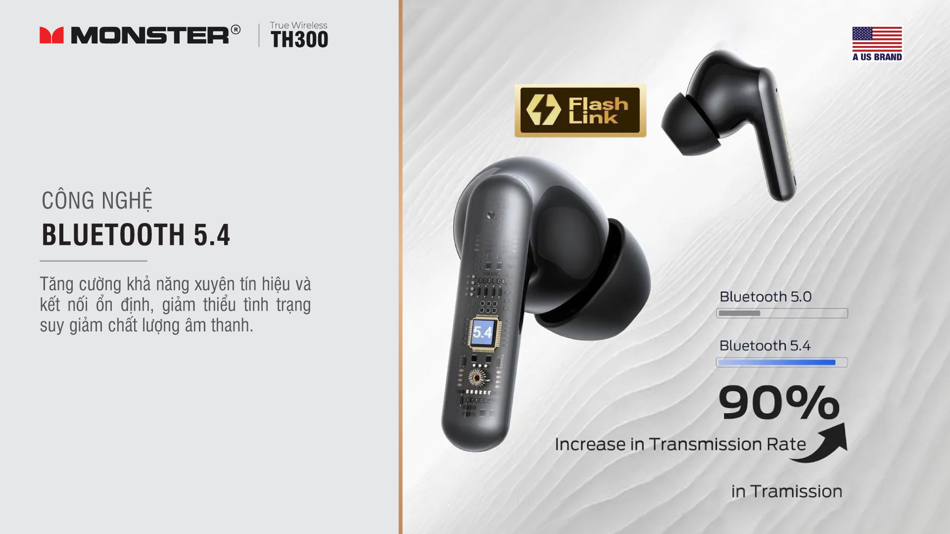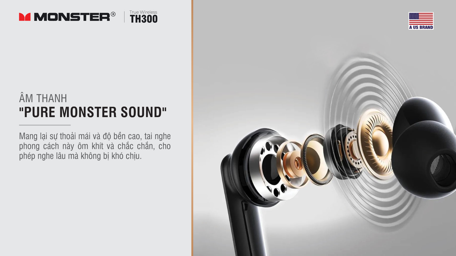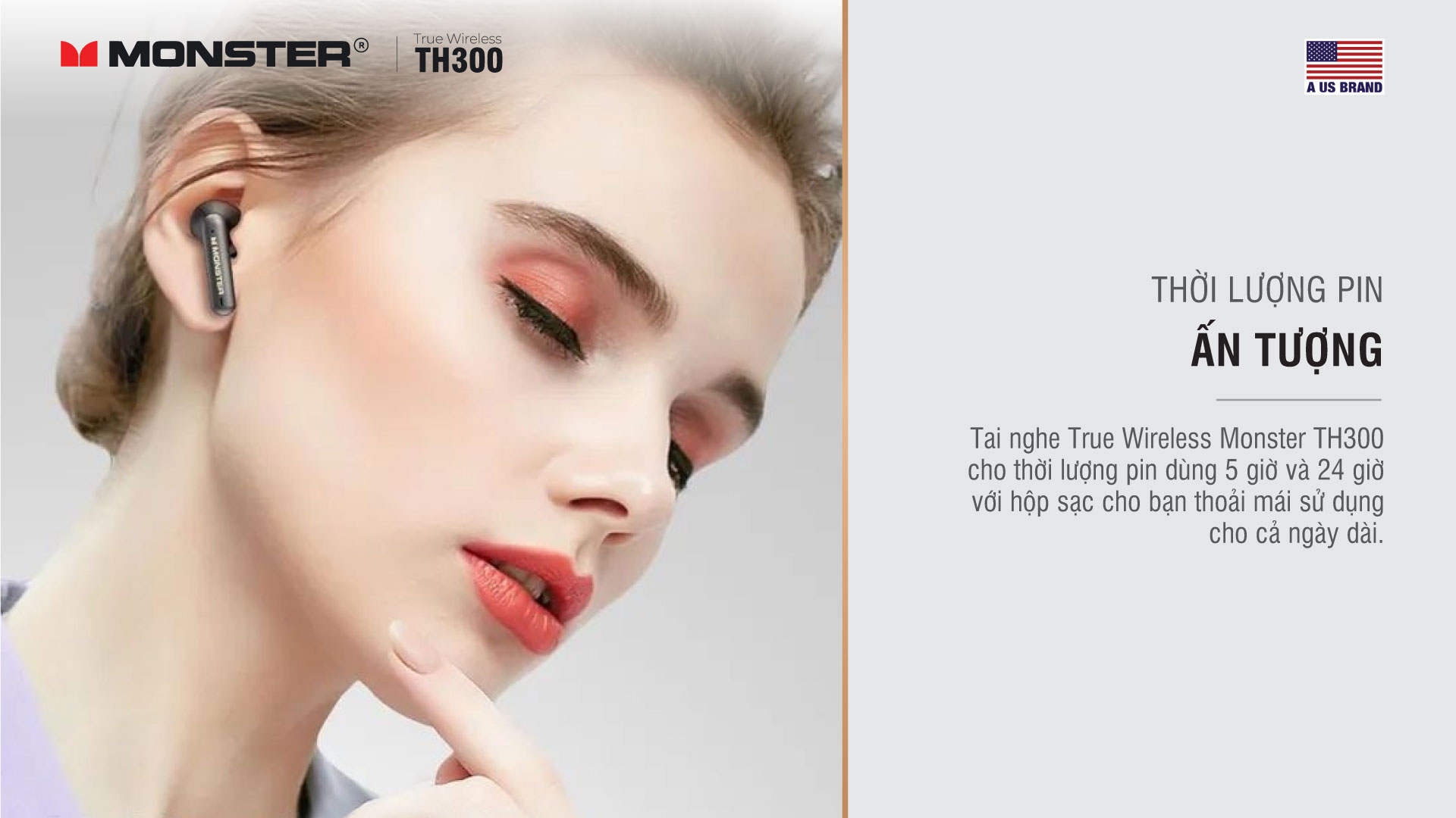 Tai nghe True Wireless Monster TH300 cho thời lượng pin dùng 5 giờ và 24 giờ với hộp sạc cho bạn thoải mái sử dụng cho cả ngày dài.
