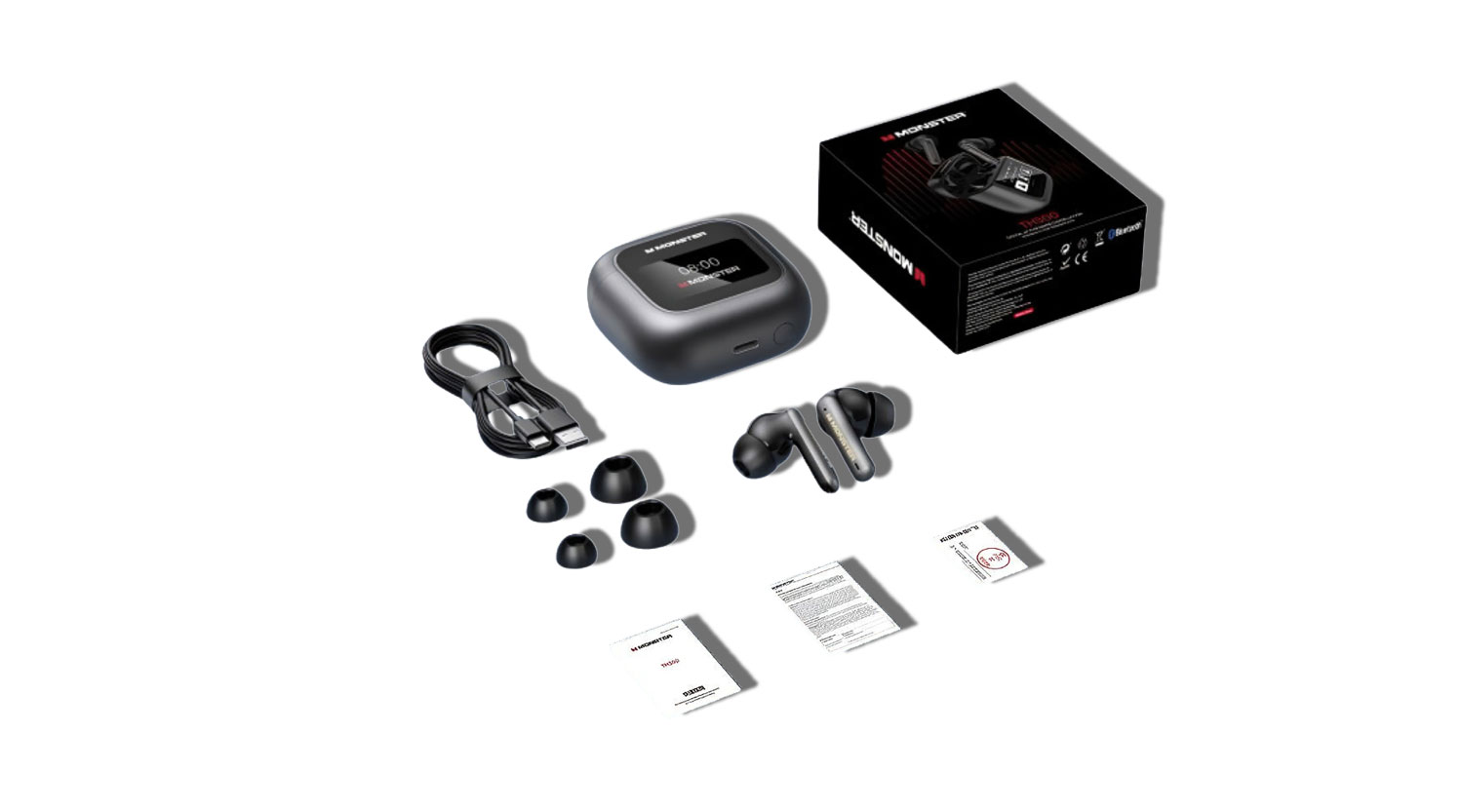 Tai nghe Bluetooth không dây Monster TWS TH300, hộp sạc dây sạc, sách hướng dẫn sử dụng và bộ nút tai thay thế để vừa khít theo ý bạn.