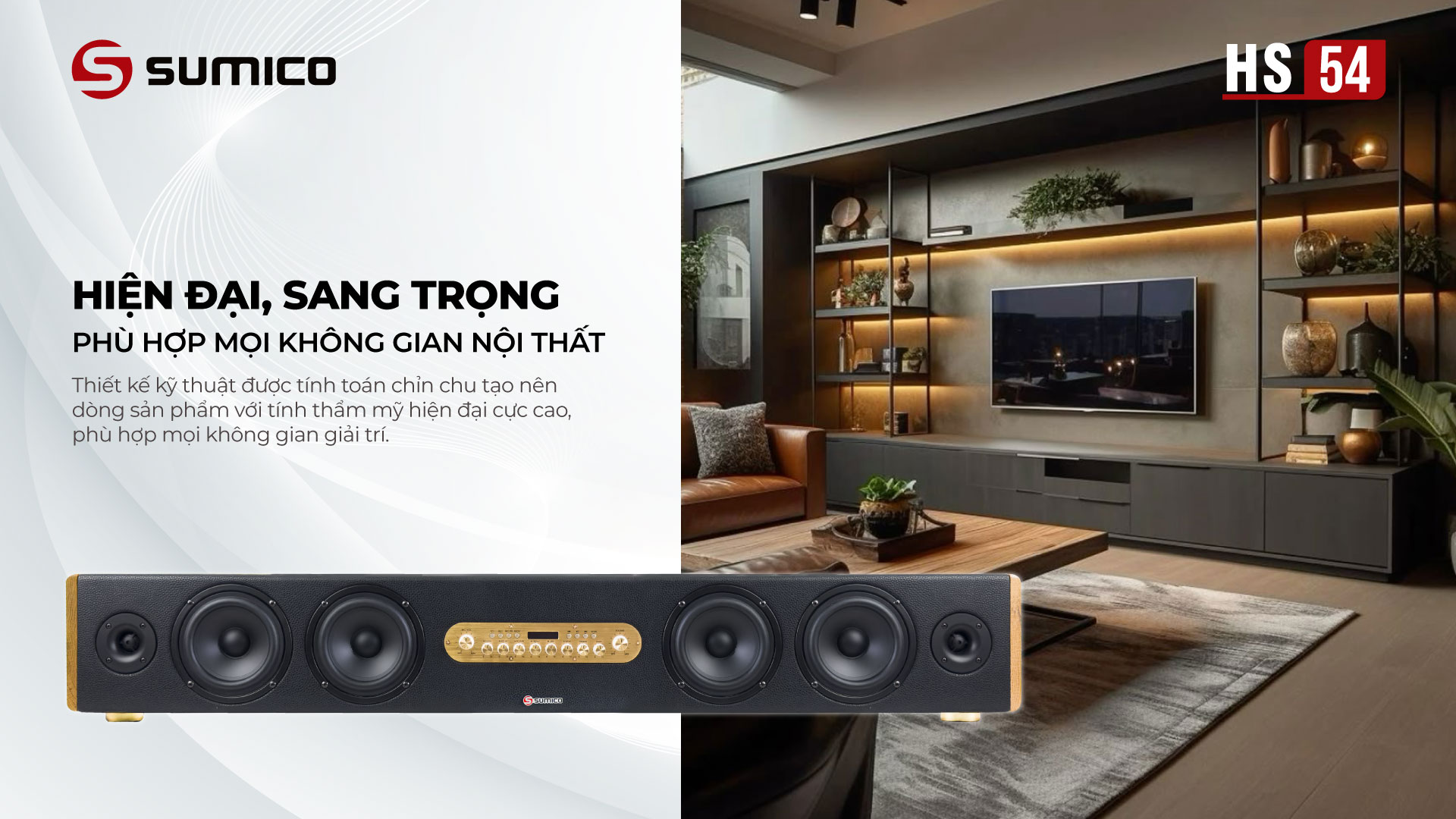 Loa Soundbar Karaoke Sumico HS54 đáp ứng xu hướng nghe nhìn hiện đại ngày nay tập trung vào sự tiện lợi và trải nghiệm thú vị hơn. Sự hiện diện của Sumico HS54 không chỉ là thiết bị giải trí cao cấp mà còn là một vật dụng trang trí nội thất tuyệt đẹp tạo điểm nhấn cho căn phòng của bạn. Sumico HS54 phù hợp bài trí cho nhiều không gian tại gia từ phòng khách, phòng ngủ đến căn hộ studio