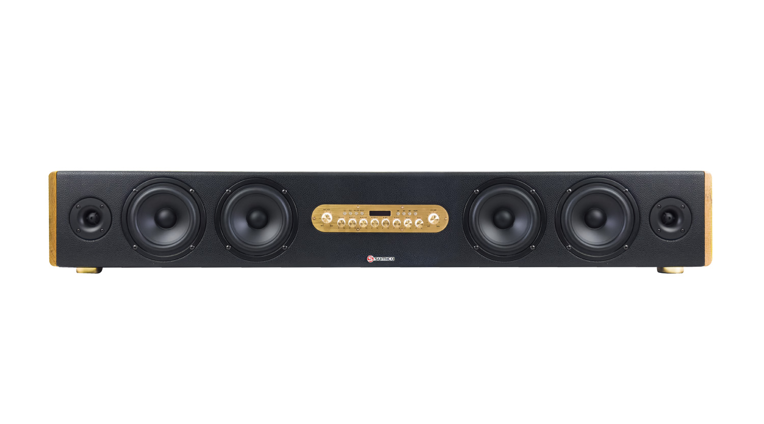Sumico HS54 được thiết kế dạng loa Soundbar có kích thước chiều rộng 1200mm x chiều sâu 190 x chiều cao 180mm dễ dàng bài trí gọn gàng trên tủ kệ kê đặt dưới Tivi 50 – 55 inch. Loa được bọc da vân đen đẹp mắt sang trọng và hai cạnh bên ốp gỗ sồi tạo điểm nhấn phối sắc tinh tế cùng cụm nút bảng điều khiển màu vàng đồng ánh kim. Mặt lưới bằng chất liệu sợi tinh chế đan dệt với độ dày và khoảng cách sợi dệt được tính toán kỹ lưỡng để bảo vệ loa con bên trong và đảm bảo đặc tính âm học. Phong cách Retro trong thiết kế loa Soundbar karaoke độc đáo của Sumico HS54 tạo nên nét đẹp hoài cổ, giúp loa luôn giữ được vẻ ngoài sang trọng và cao cấp dù qua nhiều năm bài trí sử dụng.