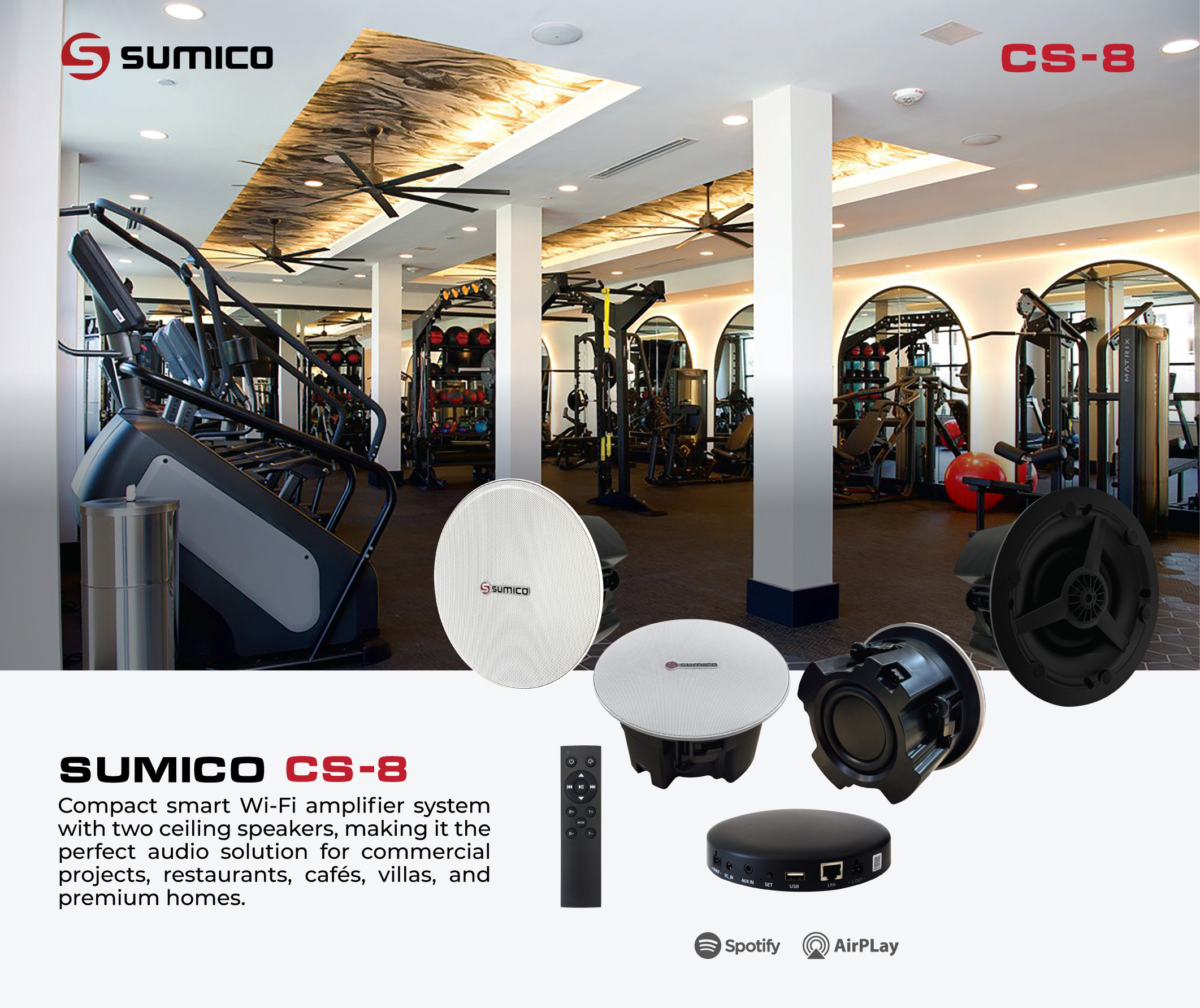 Ampli Sumico CS-8 tích hợp Wi-Fi băng tần kép 2.4GHz và 5GHz cùng cổng Ethernet chuẩn RJ45 ghim dây mạng LAN, công suất mạnh mẽ 60W x 2 (4 ohm/DC24V) và 50W x 2 (8 ohm/DC32V) sử dụng chip DSP và chip khuếch đại công suất lần lượt là Texas Instruments Hifi PCM5121 và TPA3255, tùy chọn sử dụng nguồn DC24V khi dùng cho 2 loa 8 ohm và DC32V khi dùng cho 4 loa 4 ohm, với tỷ lệ tín hiệu trên nhiễu cao, âm thanh trong trẻo. Ampli thiết kế khối tròn mỏng gọn với kích thước đường kính 154mm x chiều sâu 33mm dễ dàng lắp đặt để trên trần hoặc gắn tường. Đi kèm ampli có Remote sóng RF có thể điều khiển xuyên trần tường trong phạm vi 8 mét.