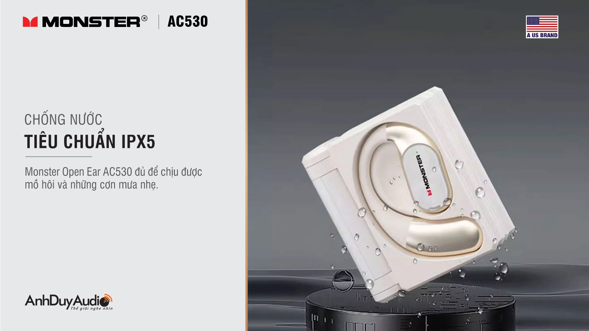 Tai nghe Monster AC530 hỗ trợ chống nước mưa nhẹ và mồ hôi theo tiêu chuẩn IPX5, trở thành lựa chọn hoàn hảo cho cả nghe nhạc, giải trí và tập luyện thể thao.