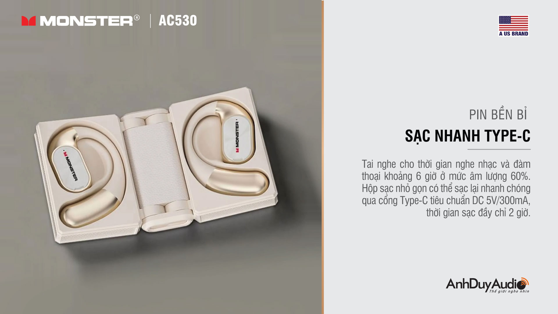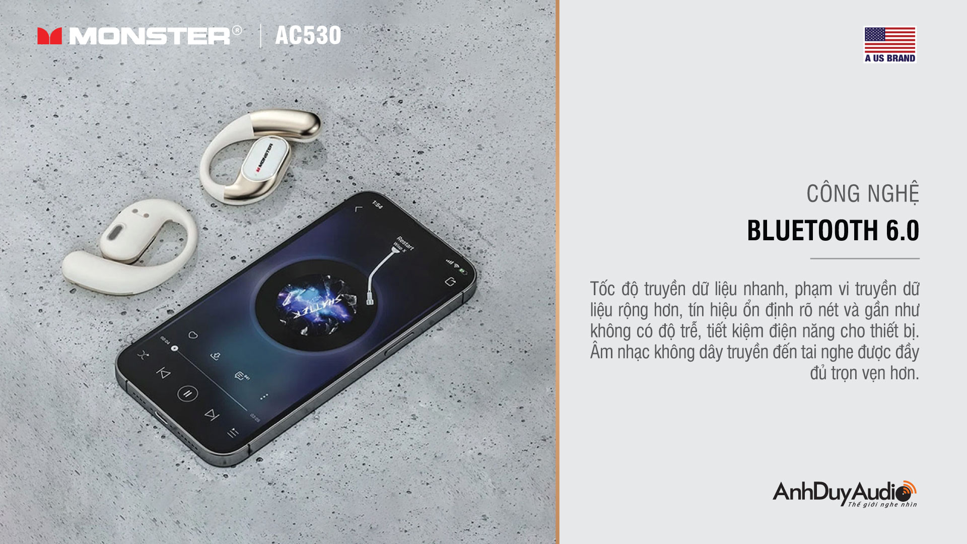 Sở hữu công nghệ Bluetooth 6.0 giúp tai nghe Monster Open Ear AC530 kết nối nhanh chóng, tín hiệu mạnh với độ trễ thấp và tiết kiệm Pin. Dù bạn đang đàm thoại hay nghe nhạc, âm thanh luôn liền mạch và rõ ràng.