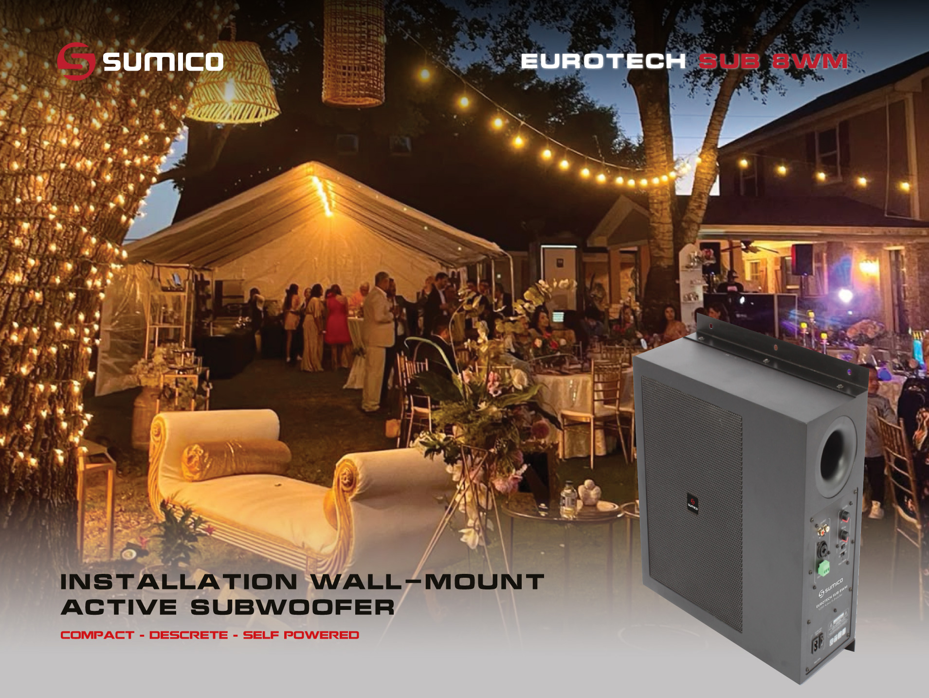 Đáp ứng nhu cầu về hệ thống âm thanh cho các công trình hiện đại cần sự tinh gọn và tính thẩm mỹ cao, loa Subwoofer Active (tích hợp ampli) Sumico EUROTECH SUB 8WM thiết kế treo tường là một giải pháp hoàn hảo dành cho không gian thương mại, giải trí, nhà hàng, café hay khu vực công cộng cao cấp, tối ưu cho việc bổ sung dải trầm sâu, chính xác mà không chiếm nhiều diện tích sử dụng.