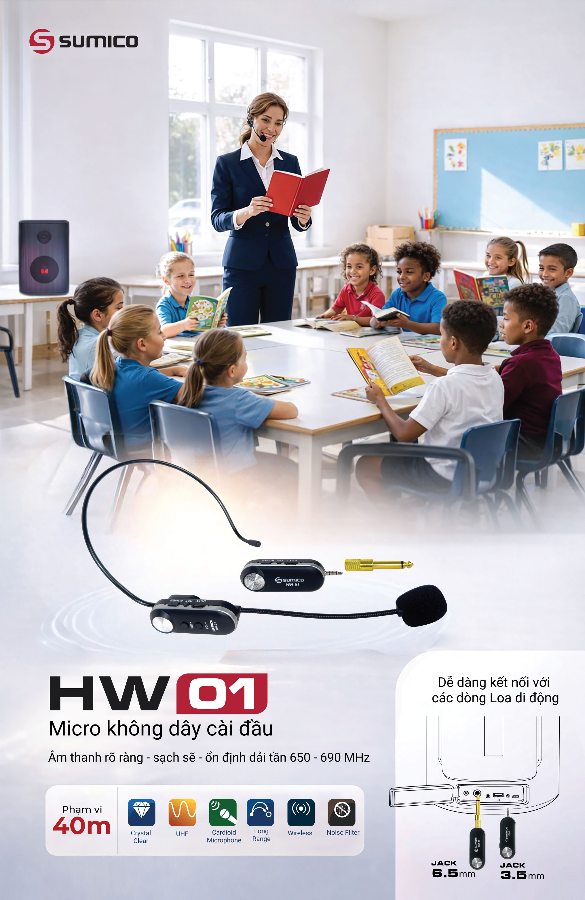 Micro không dây cài đầu Sumico HW-01 sử dụng sóng UHF hai chế độ analog/digital cùng hệ linh kiện cao cấp cho âm thanh dày sạch, rõ nét và ổn định khi truyền xa trong phạm vi khoảng 40m (không vật cản) cùng dải sóng tần số hoạt động rộng từ 650MHz-690MHz.