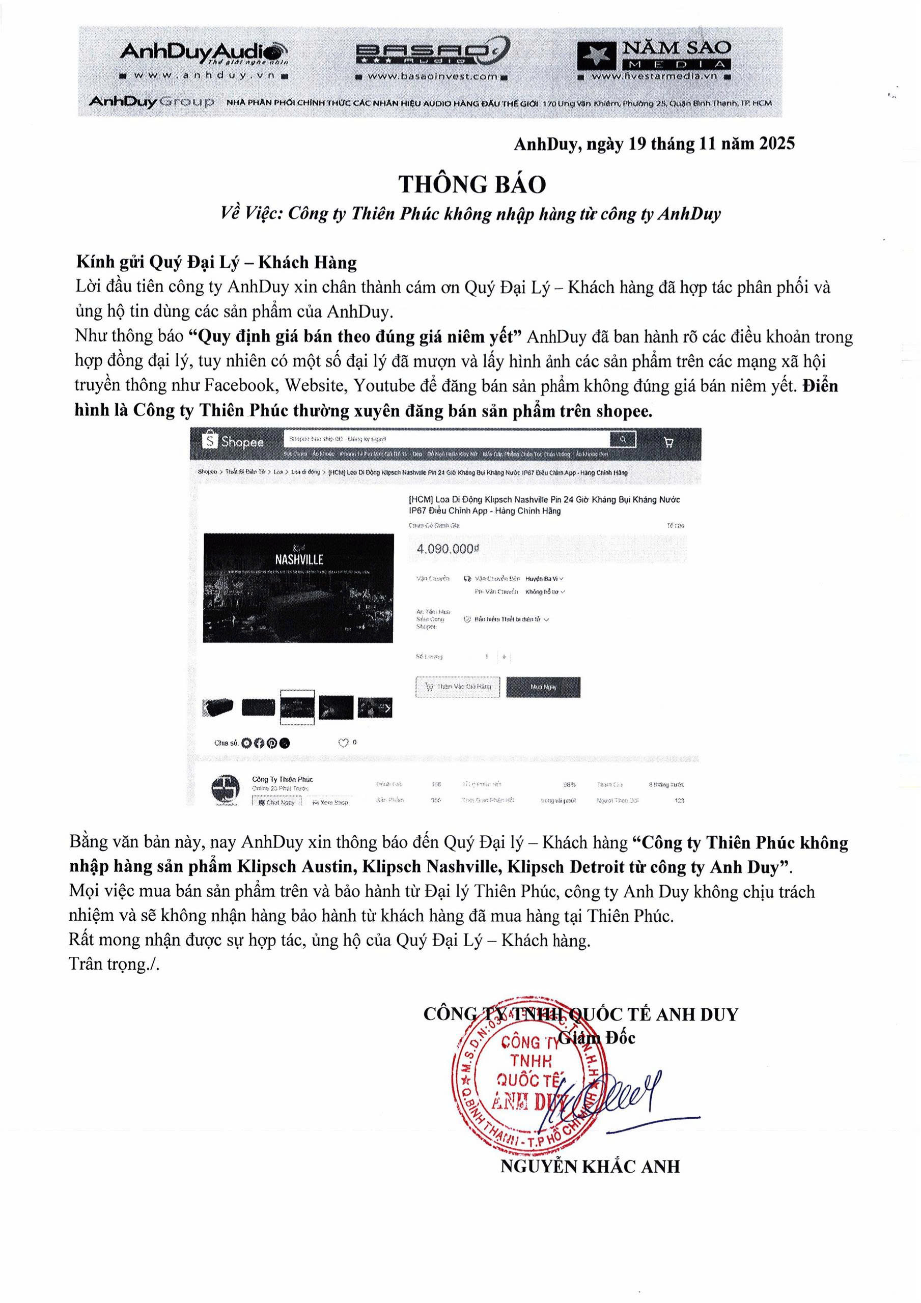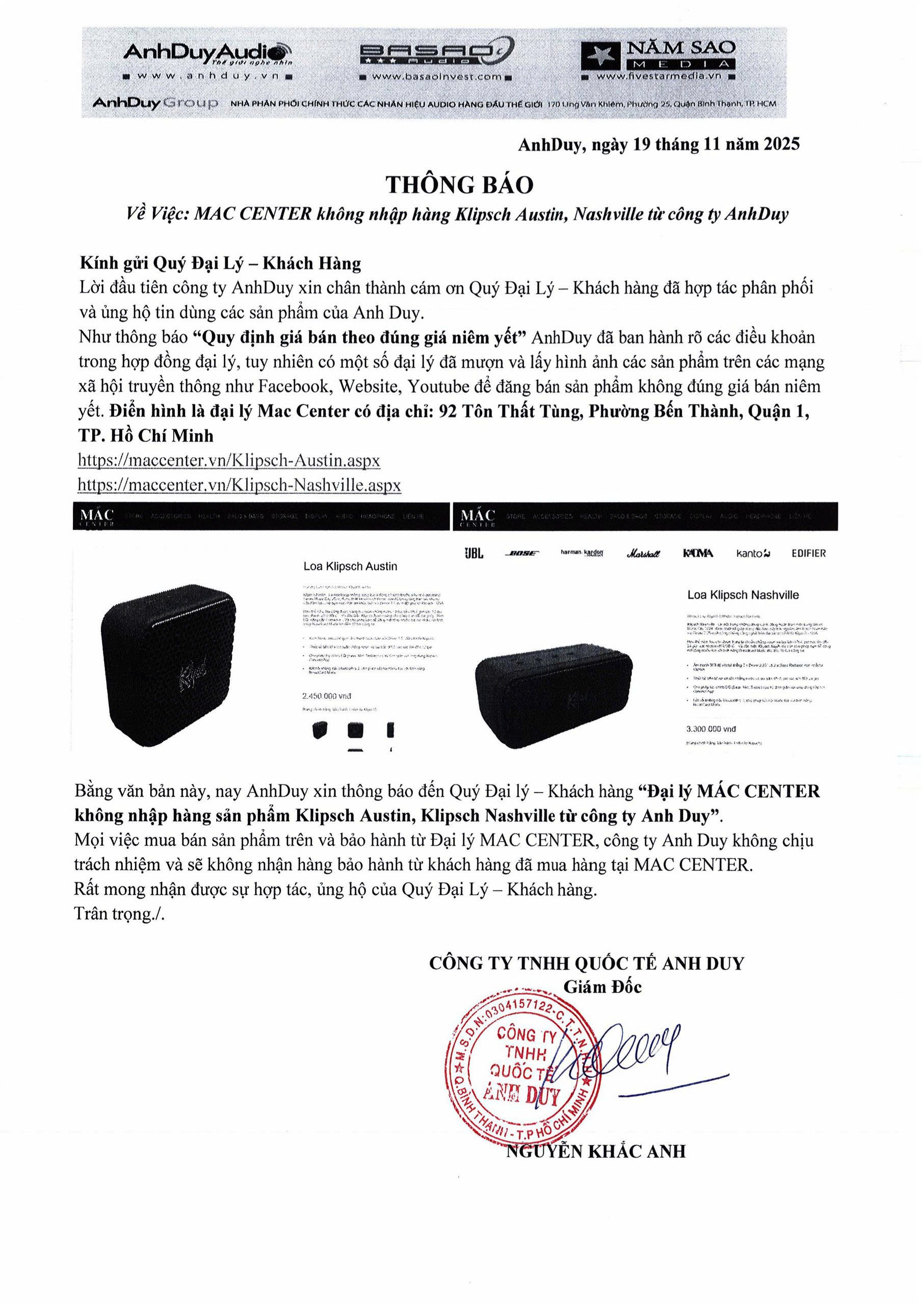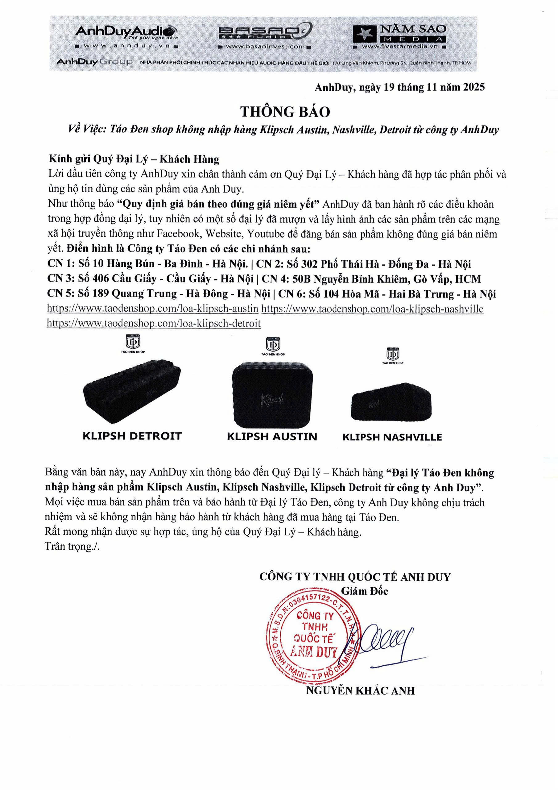 Về việc: Công ty Thiên Phúc, Đại lý Mac Center, Công ty Táo Đen không phải là đại lý nhập trực tiếp sản phẩm Klipsch Austin, Nassvile, Detroit vì quyền lợi của quý khách hàng. Nay chúng tôi xin thông báo Công ty AnhDuy sẽ không chịu trách nhiệm và bảo hành từ các đại lý nêu trên.